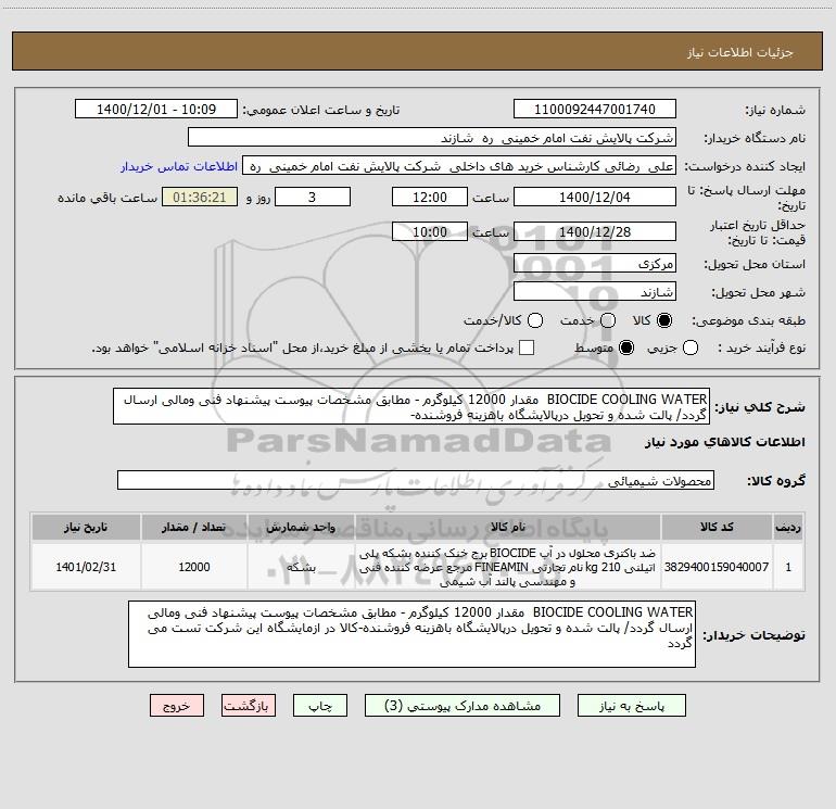 شرح کلی نیاز: BIOCIDE COOLING WATER مقدار 12000 کیلوگرم - مطابق مشخصات پیوست پیشنهاد فنی ومالی ارسال گردد/ پالت شده و تحویل درپالایشگاه باهزینه فروشنده-