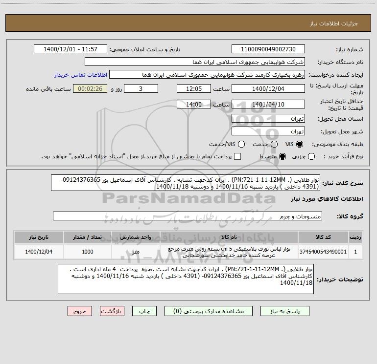 شرح کلی نیاز: نوار طلایی (. PN:721-1-11-12MM) . ایران کدجهت تشابه . کارشناس آقای اسماعیل پور 09124376365- (4391 داخلی ) بازدید شنبه 1400/11/16 و دوشنبه 1400/11/18