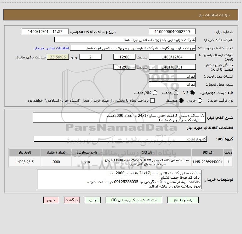 توضیحات خریدار:ساک دستی کاغذی افقی سایز24x17 به تعداد 2000عدد. ایران کد صرفا جهت تشابه. اطلاعات بیشتر تماس با آقای گرجی نیا 09125286035 در ساعت اداری. نحوه پرداخت مالی 3 ماهه ادرای.