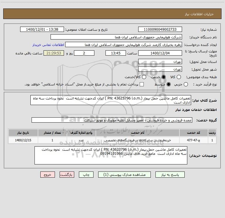 شرح کلی نیاز: تعمیرات کامل ماشین حمل بیمار (.PN: 43623796 l.o.m ) ایران کدجهت تشابه است نحوه پرداخت سه ماه اداری است