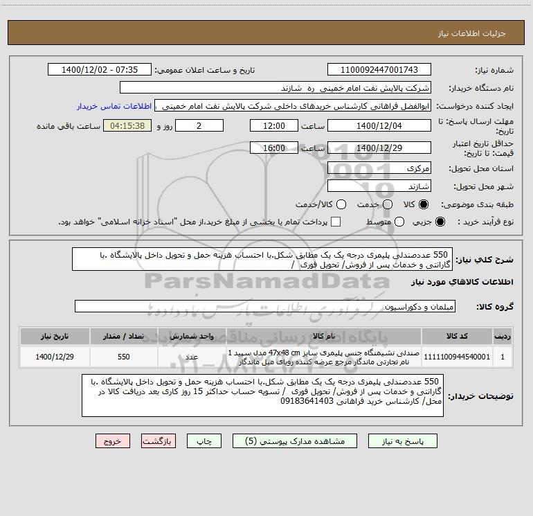 استعلام 550 عددصندلی پلیمری درجه یک یک مطابق شکل.با احتساب هزینه حمل و تحویل داخل پالایشگاه .با گارانتی و خدمات پس از فروش/ تحویل فوری / , استعلام 550 عددصندلی پلیمری درجه یک یک مطابق شکل.با احتساب هزینه حمل و تحویل داخل پالایشگاه .با گارانتی و خدمات پس از فروش/ تحویل فوری /