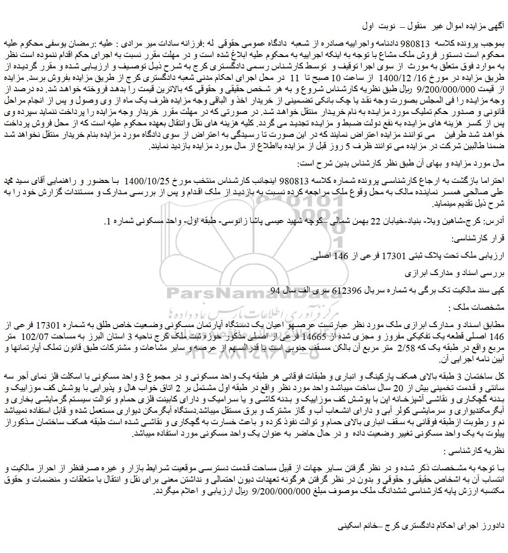 بموجب پرونده کلاسه  980813 دادنامه واجراییه صادره از شعبه  دادگاه عمومی حقوقی  له :فرزانه سادات میر مرادی : علیه :رمضان یوسفی محکوم علیه محکوم است دستور فروش ملک مشاع با توجه به اینکه اجراییه به محکوم علیه ابلاغ شده است و در مهلت مقرر نسبت به اجرای حکم اقدام ننموده است نظر به موارد فوق متعلق به مورث  از سوی اجرا توقیف و  توسط کارشناس رسمی دادگستری کرج به شرح ذیل توصیف و ارزیابی شده و مقرر گردیده از طریق مزایده در مورخ 16/ 1400/12  از ساعت 10 صبح تا  11  در محل اجرای احکام مدنی شعبه دادگستری کرج از طریق مزایده بفروش برسد. مزایده از قیمت 9/200/000/000  ریال طبق نظریه کارشناس شروع و به هر شخص حقیقی و حقوقی که بالاترین قیمت را بدهد فروخته خواهد شد. ده درصد از وجه مزایده را فی المجلس بصورت وجه نقد یا چک بانکی تضمینی از خریدار اخذ و الباقی وجه مزایده ظرف یک ماه از وی وصول و پس از انجام مراحل قانونی و صدور حکم تملیک مورد مزایده به نام خریدار منتقل خواهد شد. در صورتی که در مهلت مقرر خریدار وجه مزایده را پرداخت ننماید سپرده وی پس از کسر هزینه های مزایده به نفع دولت ضبط و مزایده تجدید می گردد. کلیه هزینه های نقل وانتقال بعهده محکوم علیه است که از محل فروش پرداخت خواهد شد طرفین    می توانند مزایده اعتراض نمایند که در این صورت تا رسیدگی به اعتراض از سوی دادگاه مورد مزایده بنام خریدار منتقل نخواهد شد ضمنا طالبین شرکت در مزایده می توانند ظرف 5 روز قبل از مزایده بااطلاع از مال مورد مزایده بازدید نمایند.