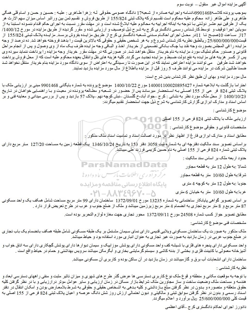 احتراما بازگشت به ابلاغیه شماره 140001100020895427 مورخ 1400/10/22 موضوع پرونده به شماره بایگانی 9901468 مبنی بر ارزیابی ملک با پلاک ثبتی 824 فر عی از 155 اصلی به استحضار میرساند پس از حضور در شعبه و مطالعه پرونده در معیت و با راهنمایی خواهان در تاریخ 1400/10/23 از محل ملک مورد نظر به نشانی : کرج –جواد آباد-خ گلستان –نبش کوچه نهم –پلاک 57 بازدید و پس از بررسی میدانی و معاینه فنی و بر اساس اسناد و مدارک ابرازی گزارش کارشناسی به شرح ذیل جهت استحضار تقدیم میگردد: