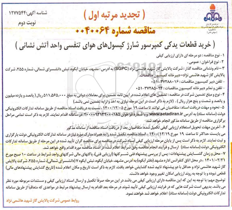 تجدید مناقصه خرید قطعات یدکی کمپرسور شارژ کپسول های هوای تنفسی واحد آتش نشانی - نوبت دوم از کلیه افراد متخصص و شرکتها واجد شرایط دعوت به عمل میآید در مناقصه با کد خبرگزاری پارس نماد: 4280978 شرکت نمایند.