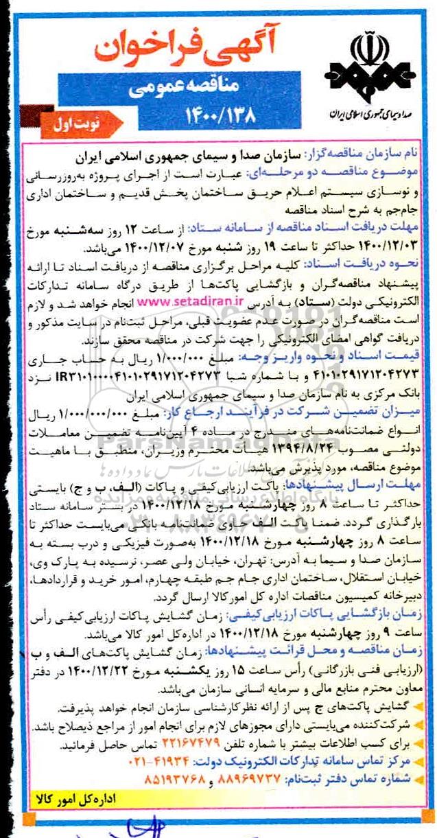 - نام سازمان مناقصه گزار: سازمان صدا و سیمای جمهوری اسلامی ایران