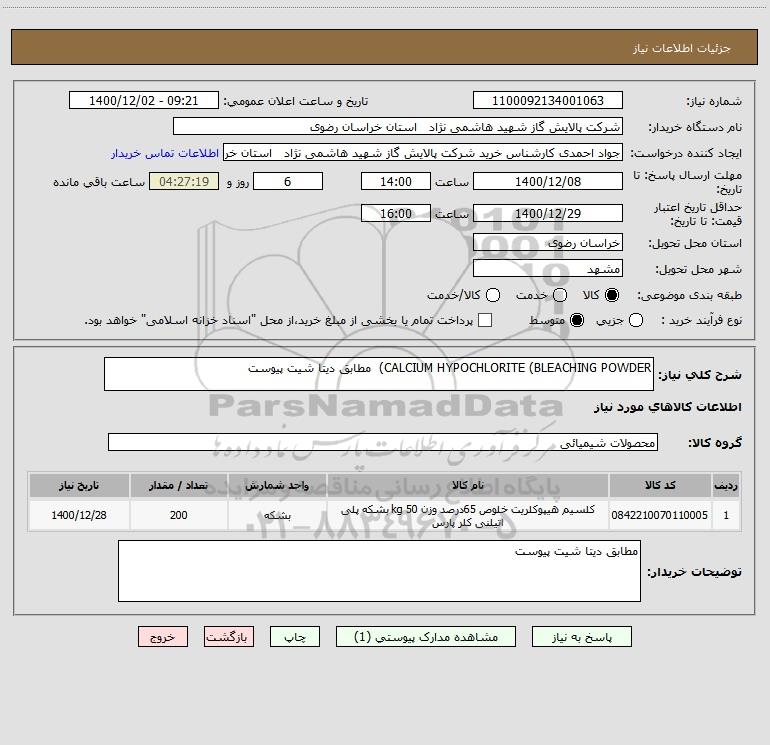 شرح کلی نیاز: CALCIUM HYPOCHLORITE (BLEACHING POWDER) مطابق دیتا شیت پیوست