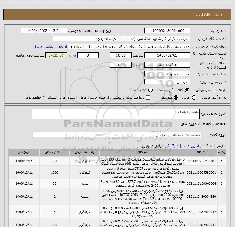 نام دستگاه خریدار:شرکت پالایش گاز شهید هاشمی نژاد استان خراسان رضوی