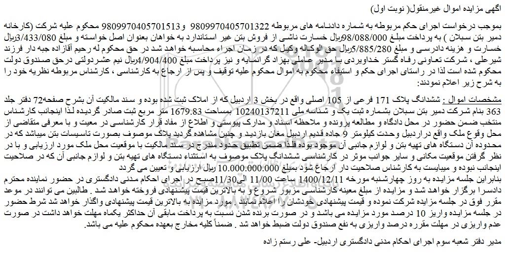 بموجب درخواست اجرای حکم مربوطه به شماره دادنامه های مربوطه 9809970405701322  و9809970405701513 محکوم علیه شرکت (کارخانه دمیر بتن سبلان ) به پرداخت مبلغ 98/088/000ریال خسارت ناشی از فروش بتن غیر استاندارد به خواهان بعنوان اصل خواسته و مبلغ 3/433/080ریال خسارت و هزینه دادرسی و مبلغ 5/885/280ریال حق الوکاله وکیل که در زمان اجراء محاسبه خواهد شد در حق محکوم له رحیم آقازاده جبه دار فرزند شیرعلی ، شرکت تعاونی رفاه گستر خداویردی با مدیر عاملی بهزاد گرانمایه و نیز پرداخت مبلغ 4/904/400ریال نیم عشردولتی درحق صندوق دولت محکوم شده است لذا در راستای اجرای حکم و استیفاء محکوم به اموال محکوم علیه توقیف و پس از ارجاع به کارشناسی ، کارشناس مربوطه نظریه خود را به شرح زیر اعلام نمودند: