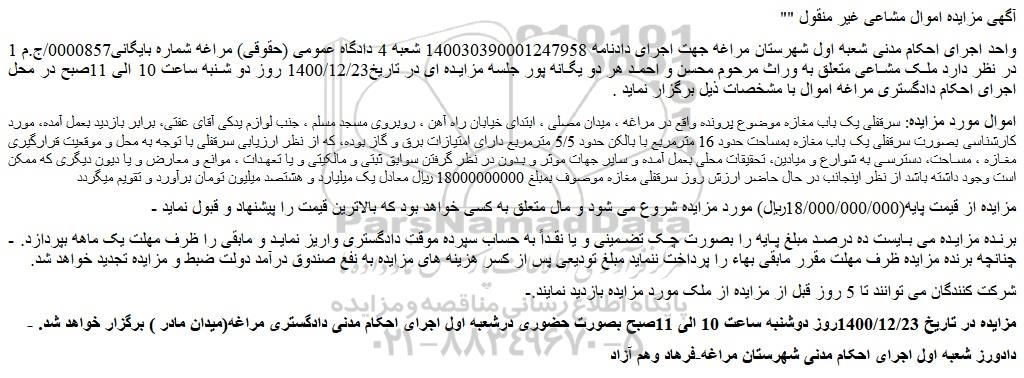 - مزایده در تاریخ 1400/12/23روز دوشنبه ساعت 10 الی 11صبح بصورت حضوری درشعبه اول اجرای احکام مدنی دادگستری مراغه(میدان مادر ) برگزار خواهد شد.