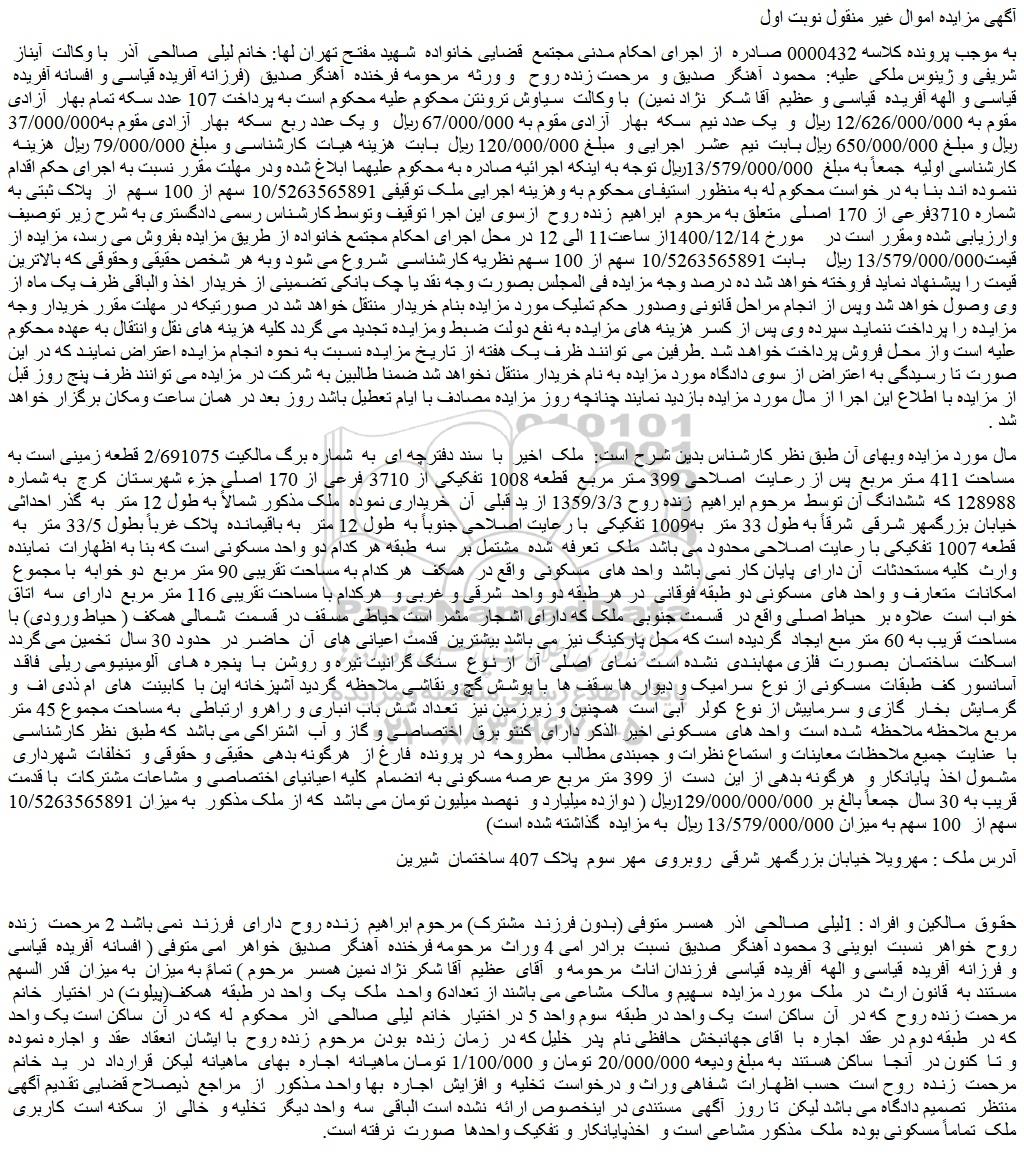به موجب پرونده کلاسه 0000432 صادره  از اجرای احکام مدنی مجتمع  قضایی خانواده  شهید مفتح تهران لها: خانم لیلی  صالحی  آذر  با وکالت  آیناز  شریفی و ژینوس ملکی  علیه:  محمود  آهنگر  صدیق و  مرحمت زنده روح   و ورثه  مرحومه فرخنده  آهنگر صدیق  (فرزانه آفریده قیاسی و افسانه آفریده  قیاسی و الهه آفریده  قیاسی و عظیم  آقا شکر  نژاد نمین)  با وکالت  سیاوش ترونتن محکوم علیه محکوم است به پرداخت 107 عدد سکه تمام بهار  آزادی مقوم به 12/626/000/000 ریال  و  یک عدد نیم  سکه  بهار  آزادی مقوم به 67/000/000 ریال   و یک عدد ربع  سکه  بهار  آزادی مقوم به37/000/000 ریال و مبلغ 650/000/000 ریال بابت  نیم  عشر  اجرایی و  مبلغ 120/000/000 ریال  بابت  هزینه هیات  کارشناسی و مبلغ 79/000/000 ریال  هزینه  کارشناسی اولیه  جمعاً به مبلغ  13/579/000/000ریال توجه به اینکه اجرائیه صادره به محکوم علیهما ابلاغ شده ودر مهلت مقرر نسبت به اجرای حکم اقدام ننموده اند بنا به در خواست محکوم له به منظور استیفای محکوم به وهزینه اجرایی ملک توقیفی 10/5263565891 سهم از 100 سهم  از  پلاک ثبتی به شماره 3710فرعی از 170 اصلی  متعلق به مرحوم  ابراهیم  زنده روح  ازسوی این اجرا توقیف وتوسط کارشناس رسمی دادگستری به شرح زیر توصیف وارزیابی شده ومقرر است در    مورخ 1400/12/14از ساعت11 الی 12 در محل اجرای احکام مجتمع خانواده از طریق مزایده بفروش می رسد، مزایده از قیمت13/579/000/000 ریال    بابت 10/5263565891 سهم از 100 سهم نظریه کارشناسی  شروع می شود وبه هر شخص حقیقی وحقوقی که بالاترین قیمت را پیشنهاد نماید فروخته خواهد شد ده درصد وجه مزایده فی المجلس بصورت وجه نقد یا چک بانکی تضمینی از خریدار اخذ والباقی ظرف یک ماه از وی وصول خواهد شد وپس از انجام مراحل قانونی وصدور حکم تملیک مورد مزایده بنام خریدار منتقل خواهد شد در صورتیکه در مهلت مقرر خریدار وجه مزایده را پرداخت ننماید سپرده وی پس از کسر هزینه های مزایده به نفع دولت ضبط ومزایده تجدید می گردد کلیه هزینه های نقل وانتقال به عهده محکوم علیه است واز محل فروش پرداخت خواهد شد .طرفین می توانند ظرف یک هفته از تاریخ مزایده نسبت به نحوه انجام مزایده اعتراض نمایند که در این صورت تا رسیدگی به اعتراض از سوی دادگاه مورد مزایده به نام خریدار منتقل نخواهد شد ضمنا طالبین به شرکت در مزایده می توانند ظرف پنج روز قبل از مزایده با اطلاع این اجرا از مال مورد مزایده بازدید نمایند چنانچه روز مزایده مصادف با ایام تعطیل باشد روز بعد در همان ساعت ومکان برگزار خواهد شد .