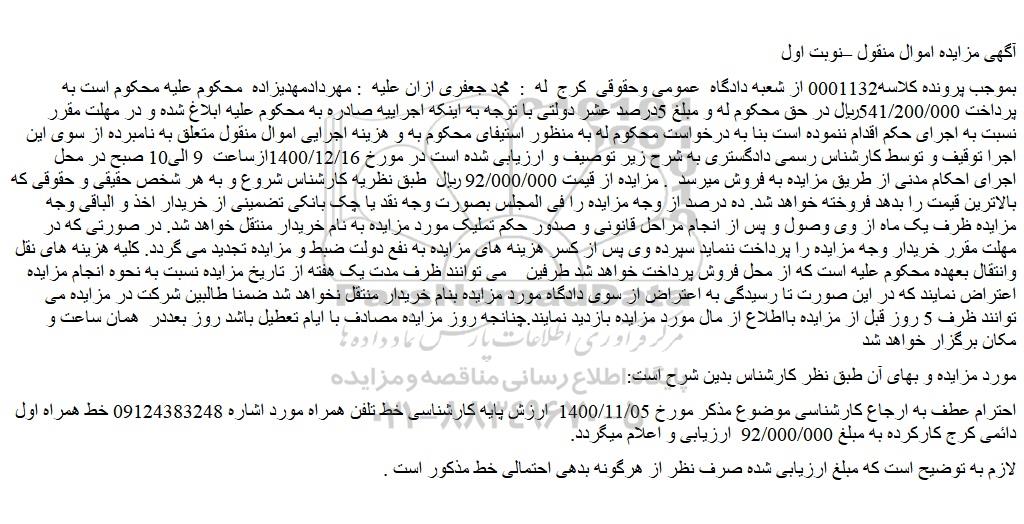 بموجب پرونده کلاسه0001132 از شعبه دادگاه عمومی وحقوقی کرج له : محمد جعفری ازان علیه : مهردادمهدیزاده محکوم علیه محکوم است به پرداخت 541/200/000ریال در حق محکوم له و مبلغ 5درصد عشر دولتی با توجه به اینکه اجراییه صادره به محکوم علیه ابلاغ شده و در مهلت مقرر نسبت به اجرای حکم اقدام ننموده است بنا به درخواست محکوم له به منظور استیفای محکوم به و هزینه اجرایی اموال منقول متعلق به نامبرده از سوی این اجرا توقیف و توسط کارشناس رسمی دادگستری به شرح زیر توصیف و ارزیابی شده است در مورخ 1400/12/16ازساعت 9 الی10 صبح در محل اجرای احکام مدنی از طریق مزایده به فروش میرسد . مزایده از قیمت 92/000/000 ریال طبق نظریه کارشناس شروع و به هر شخص حقیقی و حقوقی که بالاترین قیمت را بدهد فروخته خواهد شد. ده درصد از وجه مزایده را فی المجلس بصورت وجه نقد یا چک بانکی تضمینی از خریدار اخذ و الباقی وجه مزایده ظرف یک ماه از وی وصول و پس از انجام مراحل قانونی و صدور حکم تملیک مورد مزایده به نام خریدار منتقل خواهد شد. در صورتی که در مهلت مقرر خریدار وجه مزایده را پرداخت ننماید سپرده وی پس از کسر هزینه های مزایده به نفع دولت ضبط و مزایده تجدید می گردد. کلیه هزینه های نقل وانتقال بعهده محکوم علیه است که از محل فروش پرداخت خواهد شد طرفین می توانند ظرف مدت یک هفته از تاریخ مزایده نسبت به نحوه انجام مزایده اعتراض نمایند که در این صورت تا رسیدگی به اعتراض از سوی دادگاه مورد مزایده بنام خریدار منتقل نخواهد شد ضمنا طالبین شرکت در مزایده می توانند ظرف 5 روز قبل از مزایده بااطلاع از مال مورد مزایده بازدید نمایند.چنانجه روز مزایده مصادف با ایام تعطیل باشد روز بعددر همان ساعت و مکان برگزار خواهد شد
