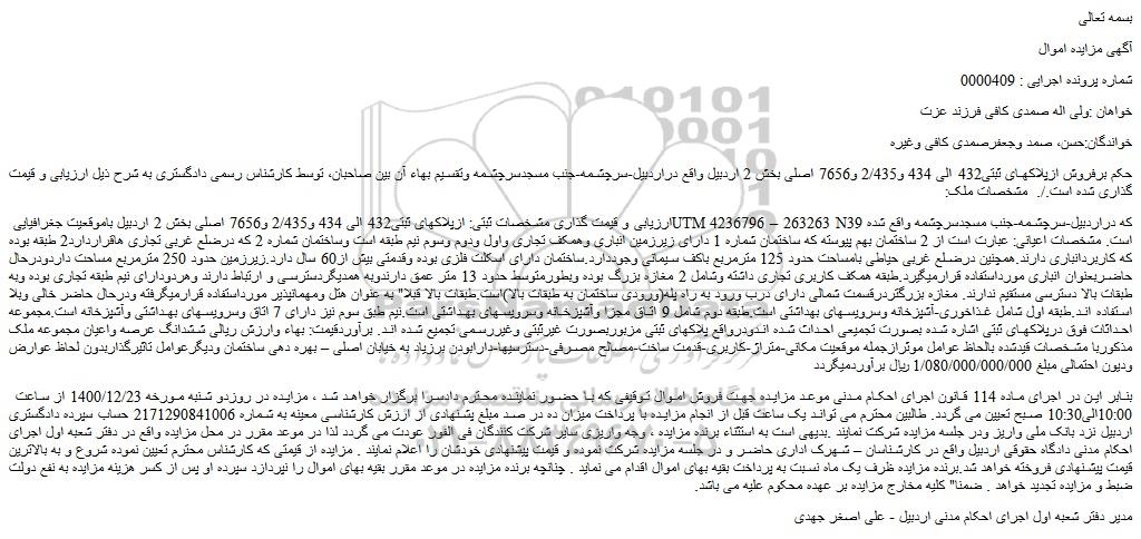 حکم برفروش ازپلاکهای ثبتی432 الی 434 و2/435 و7656 اصلی بخش 2 اردبیل واقع دراردبیل-سرچشمه-جنب مسجدسرچشمه وتقسیم بهاء آن بین صاحبان، توسط کارشناس رسمی دادگستری به شرح ذیل ارزیابی و قیمت گذاری شده است./.  مشخصات ملک: