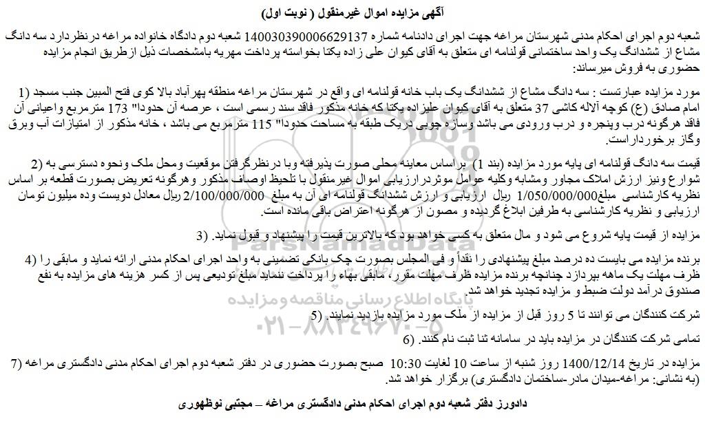 1) مورد مزایده عبارتست : سه دانگ مشاع از ششدانگ یک باب خانه قولنامه ای واقع در شهرستان مراغه منطقه پهرآباد بالا کوی فتح المبین جنب مسجد امام صادق (ع) کوچه آلاله کاشی 37 متعلق به آقای کیوان علیزاده یکتا که خانه مذکور فاقد سند رسمی است ، عرصه آن حدودا" 173 مترمربع واعیانی آن فاقد هرگونه درب وپنجره و درب ورودی می باشد وسازه چوبی دریک طبقه به مساحت حدودا" 115 مترمربع می باشد ، خانه مذکور از امتیازات آب وبرق وگاز برخورداراست.