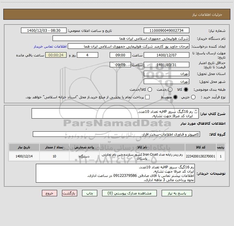شرح کلی نیاز: رم 16گیگ سرور HPبه تعداد 10عدد.