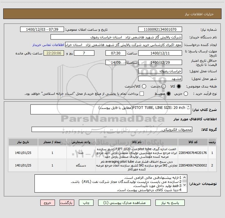 شرح کلی نیاز: PITOT TUBE, LINE SIZE: 20 inch(مطابق با فایل پیوست)