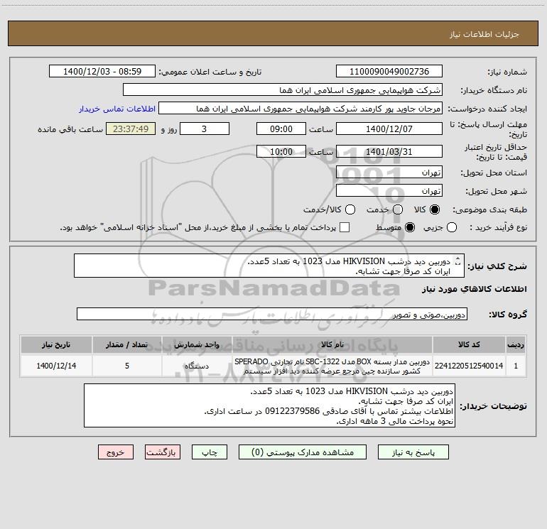 شرح کلی نیاز: دوربین دید درشب HIKVISION مدل 1023 به تعداد 5عدد.