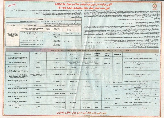 آگهی مزایده سراسری نوبت پنجم املاک و اموال مازاد اداره امور شعب استان چهارمحال و بختیاری اسفندماه 1400