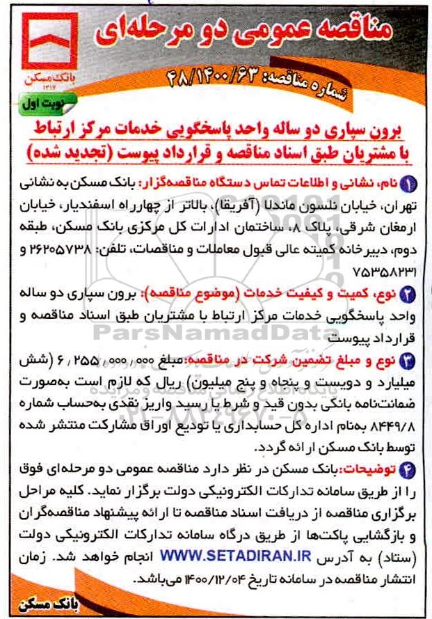 تجدید مناقصه برون سپاری دو ساله واحد پاسخگویی خدمات مرکز ارتباط با مشتریان از کلیه افراد متخصص و شرکت‌ها واجد شرایط دعوت به عمل می‌آید در مناقصه با کد خبرگزاری پارس نماد: 4288417 شرکت نمایند. این مناقصه در تاریخ 1400/12/03 شروع و مهلت آن تا تاریخ 1400/12/23 میباشد.