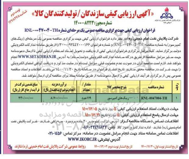 شرکت پالایش نفت امام خمینی (ره) در نظر دارد فراخوان ارزیابی کیفی جهت برگزاری مناقصه عمومی یک مرحله ای (رینگ های کمپرسور ) به شماره مناقصه RNL-0047004-TH و شماره فراخوان 2000092447000166 را از طریق سامانه تدارکات الکترونیکی دولت برگزار نماید. کلیه مراحل برگزاری فراخوان ارزیابی کیفی از دریافت و تحویل اسناد استعلام ارزیابی کیفی تا ارسال دعوتنامه جهت سایر مراحل مناقصه از طریق درگاه سامانه تدارکات الکترونیکی دولت ستاد ایران انجام خواهد شد. لازم است مناقصه گران در صورت عدم عضویت قبلی مراحل ثبت نام در سایت مذکور و دریافت گواهی امضای الکترونیکی را جهت شرکت در مناقصه محقق سازند. تاریخ انتشار فراخوان در سامانه تاریخ 1400.11.30 می باشد. اطلاعات و اسناد مناقصه عمومی پس از برگزاری فرآیند ارزیابی کیفی و ارسال دعوتنامه از طریق سامانه ستاد به مناقصه گران ارسال خواهد شد.
