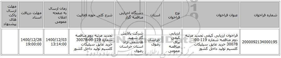 2000092134000195فراخوان ارزیابی کیفی تجدید مرتبه دوم مناقصه شماره 119-00-30078 خرید عایق سیلیکات کلسیم تولید داخل کشورارزیابی کیفی برای مناقصه عمومیخراسان رضویشرکت پالایش گاز شهید هاشمی نژاد استان خراسان رضویتجدید مرتبه دوم مناقصه شماره 119-00-30078 خرید عایق سیلیکات کلسیم تولید داخل کشور1400/12/03 13:14:001400/12/28 19:00:00