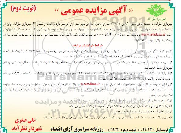 شهرداری نظرآباد در نظر دارد برداشت از معدن 62 شهرداری نظراباد واقع در تهراندشت را به مدت یکسال از طریق مزایده عمومی به صورت کارگزاری و با جزییات مندرج در اسناد مزایده با بهره گیری از سامانه تدارکات الکترونیکی دولت ستاد و با شماره مزایده 5000005366000005 به صورت الکترونیکی واگذار نماید. متقاضیان می توانند با واریز سپرده شرکت در مزایده قیمت پینشهادی خود را ارائه نمایند