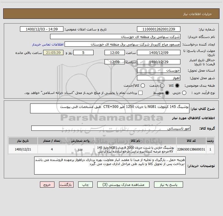 شرح کلی نیاز: بوشینگ 145 کیلوولت NGB1 با جریان 1250 آمپر CTE=500 طبق مشخصات فنی پیوست