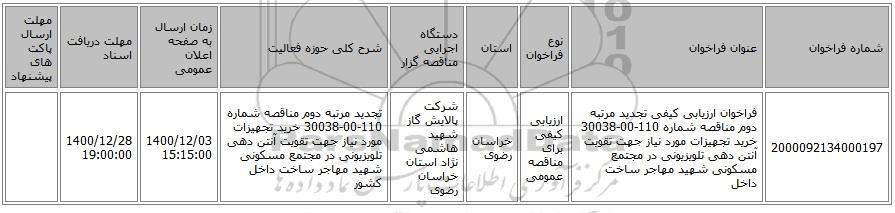 مناقصه، فراخوان ارزیابی کیفی تجدید مرتبه دوم مناقصه شماره 110-00-30038 خرید تجهیزات مورد نیاز جهت تقویت آنتن دهی تلویزیونی در مجتمع مسکونی شهید مهاجر ساخت داخل از کلیه افراد متخصص و شرکت‌ها واجد شرایط دعوت به عمل می‌آید در مناقصه با کد خبرگزاری پارس نماد: 4289748 شرکت نمایند. این مناقصه در تاریخ 1400/12/03 شروع و مهلت آن تا تاریخ 1400/12/28 میباشد.