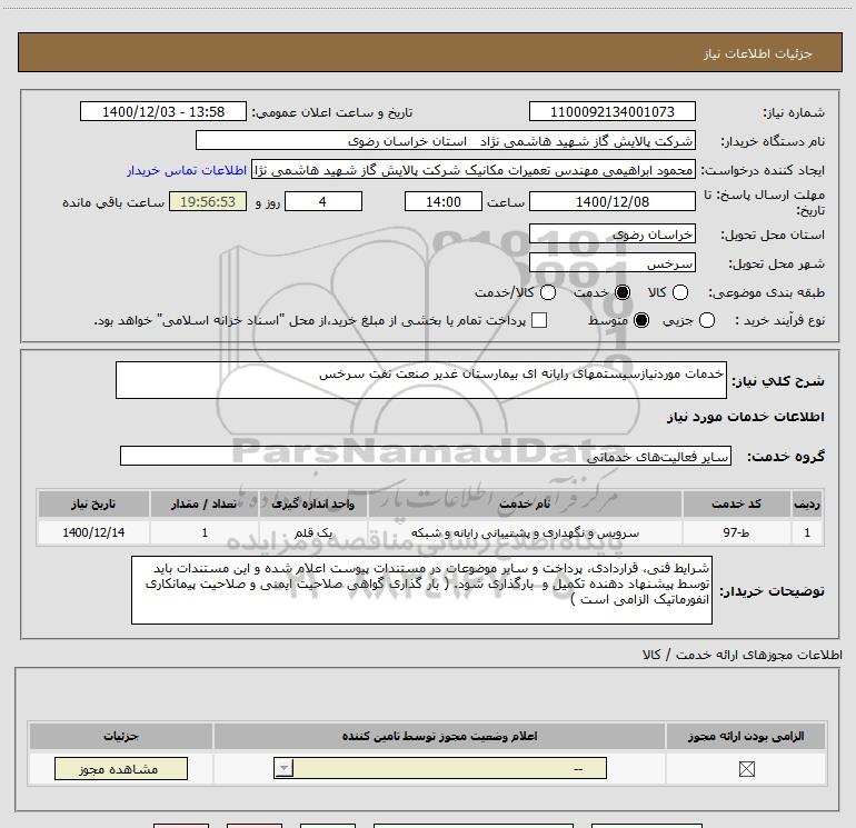 نام دستگاه خریدار:شرکت پالایش گاز شهید هاشمی نژاد استان خراسان رضوی