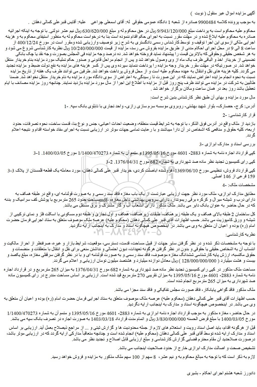 محکوم علیه محکوم است به پرداخت مبلغ 9/943/120/000 ریال در حق محکوم له و مبلغ 630/620/000 ریال نیم عشر دولتی. با توجه به اینکه اجرائیه صادره به محکوم علیه ابلاغ شده و در مهلت مقرر نسبت به اجرای حکم اقدام ننموده است بنا به درخواست محکوم له به منظور استیفای محکوم به و هزینه اجرایی ملکی ازسوی این اجرا توقیف و توسط کارشناس رسمی دادگستری به شرح زیر توصیف وارزیابی شده ومقرر است در مورخ 400/12/24 از ساعت 8 الی 9 در محل اجرای احکام مدنی از طریق مزایده بفروش می رسد، مزایده از قیمت 10/240/000/000 ریال نظریه کارشناسی شروع می شود و به هر شخص حقیقی وحقوقی که بالاترین قیمت را پیشنهاد نماید فروخته خواهد شد. ده درصد وجه مزایده فی المجلس بصورت وجه نقد یا چک بانکی تضمینی از خریدار اخذ و الباقی ظرف یک ماه از وی وصول خواهد شد و پس از انجام مراحل قانونی و صدور حکم تملیک مورد مزایده بنام خریدار منتقل خواهد شد. در صورتیکه در مهلت مقرر خریدار وجه مزایده را پرداخت ننماید سپرده وی پس از کسر هزینه های مزایده به نفع دولت ضبط و مزایده تجدید می گردد. کلیه هزینه های نقل وانتقال به عهده محکوم علیه است و از محل فروش پرداخت خواهد شد. طرفین می توانند ظرف یک هفته از تاریخ مزایده نسبت به نحوه انجام مزایده اعتراض نمایند که در این صورت تا رسیدگی به اعتراض از سوی دادگاه مورد مزایده به نام خریدار منتقل نخواهد شد. ضمنا طالبین به شرکت در مزایده می توانند ظرف پنج روز قبل از مزایده با اطلاع این اجرا از مال مورد مزایده بازدید نمایند. چنانچه روز مزایده مصادف با ایام تعطیل باشد روز بعد در همان ساعت ومکان برگزار خواهد شد .