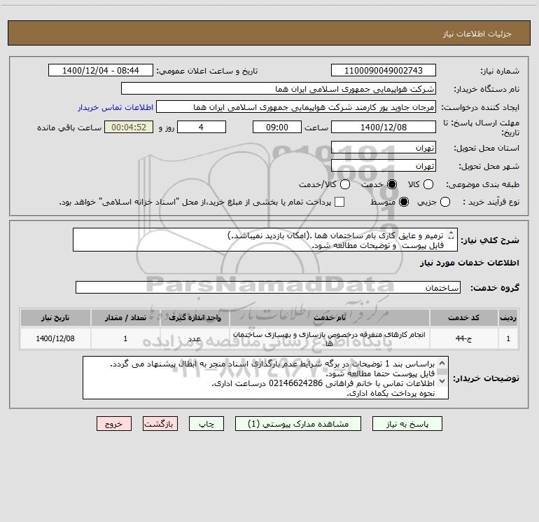 شرح کلی نیاز: ترمیم و عایق کاری بام ساختمان هما .(امکان بازدید نمیباشد.)