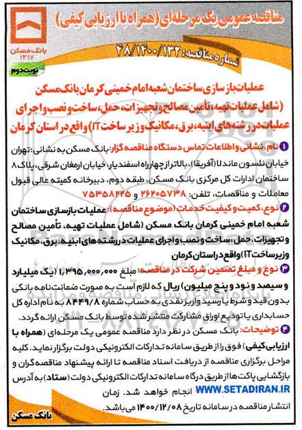 عملیات بازسازی ساختمان شعبه امام خمینی کرمان شامل عملیات تهیه، تامین مصالح و تجهیزات، حمل، ساخت و نصب و اجرای عملیات در رشته های ابنیه و برق و مکانیک و زیرساخت IT اقع در استان کرمان