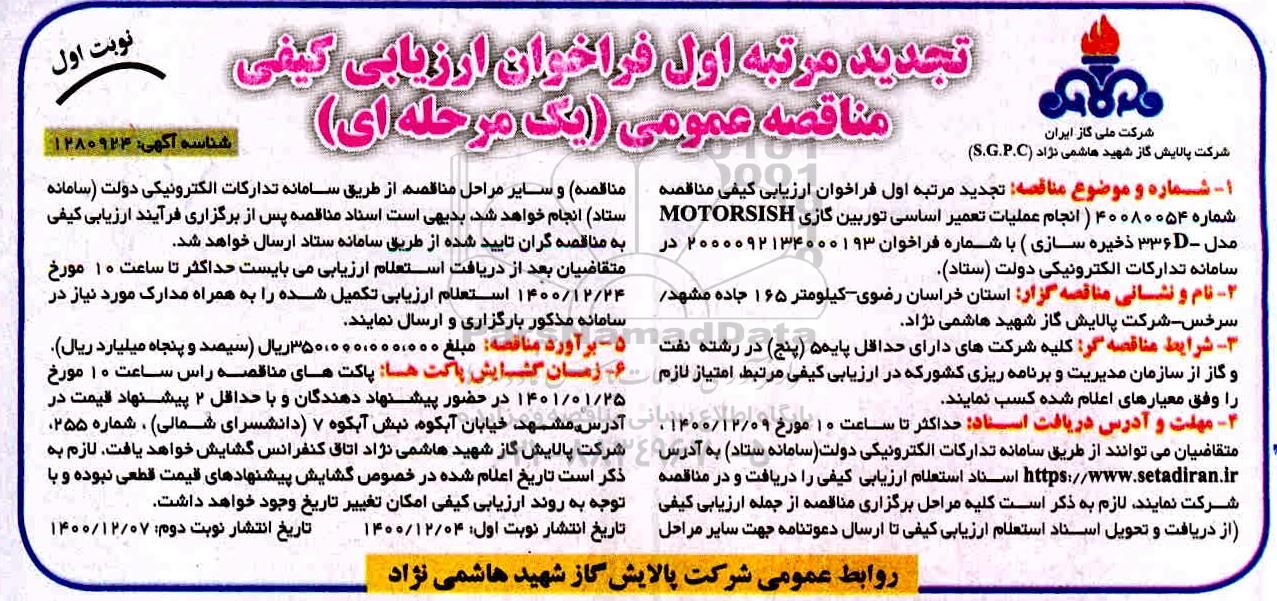 تجدید مرتبه اول فراخوان ارزیابی کیفی مناقصه انجام عملیات تعمیر اساسی توربین گازی MOTORSISH از کلیه افراد متخصص و شرکتها واجد شرایط دعوت به عمل میآید در مناقصه با کد خبرگزاری پارس نماد: 4291015 شرکت نمایند.
