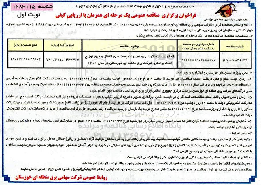 2000001262000076 | انجام عملیات نگهداری و تعمیرات پست های انتقال و فوق توزیع تحت پوشش شرکت برق منطقه ای خوزستان در سال 1401 |