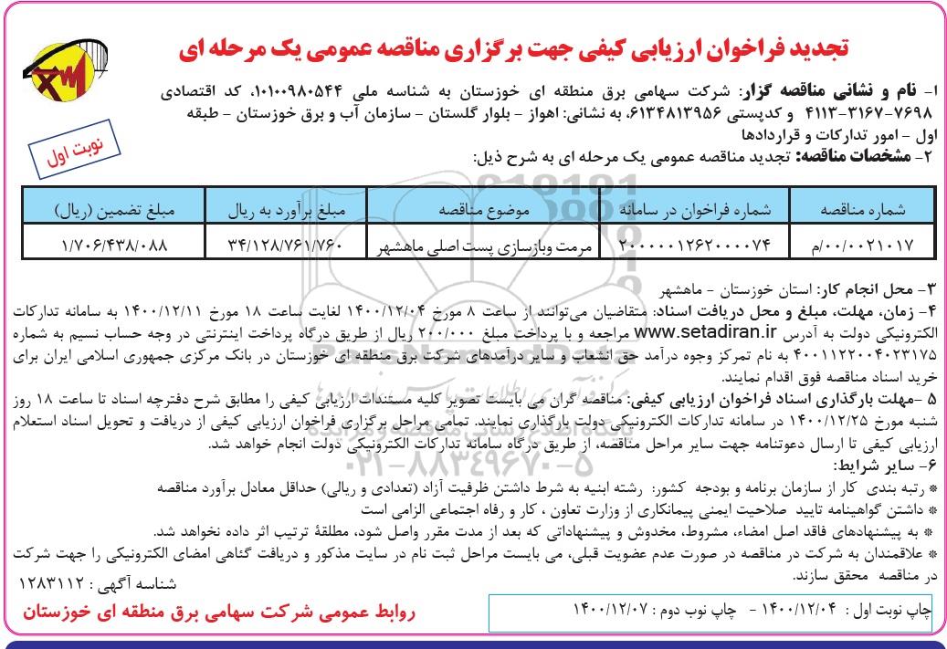 تجدید فراخوان ارزیابی کیفی مناقصه مرمت و بازسازی پست اصلی از کلیه افراد متخصص و شرکتها واجد شرایط دعوت به عمل میآید در مناقصه با کد خبرگزاری پارس نماد: 4293457 شرکت نمایند.