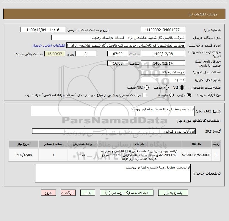 نام دستگاه خریدار:شرکت پالایش گاز شهید هاشمی نژاد استان خراسان رضوی