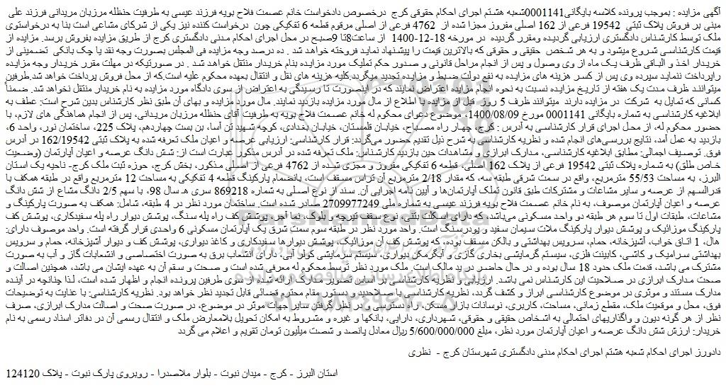 آگهی مزایده : بموجب پرونده کلاسه بایگانی0001141شعبه هشتم اجرای احکام حقوقی کرج درخصوص دادخواست خانم عصمت فلاح بویه فرزند عیسی به طرفیت حنظله مرزبان مریدانی فرزند علی مبنی بر فروش پلاک ثبتی 19542 فرعی از 162 اصلی مفروز مجزا شده از 4762 فرعی از اصلی مرقوم قطعه 6 تفکیکی چون درخواست کننده نیز یکی از شرکای مشاعی است بنا به درخواستوی ملک توسط کارشناس دادگستری ارزیابی گردیده ومقرر گردیده در مورخه 18-12-1400 از ساعت8تا 9صبح در محل اجرای احکام مدنی دادگستری کرج از طریق مزایده بفروش برسد. مزایده از قیمت کارشناسی شروع میشود و به هر شخص حقیقی و حقوقی که بالاترین قیمت را پیشنهاد نماید فروخته خواهد شد . ده درصد وجه مزایده فی المجلس بصورت وجه نقد یا چک بانکی تضمینی از خریدار اخذ و الباقی ظرف یک ماه از وی وصول و پس از انجام مراحل قانونی و صدور حکم تملیک مورد مزایده بنام خریدار منتقل خواهد شد . در صورتیکه در مهلت مقرر خریدار وجه مزایده راپرداخت ننماید سپرده وی پس از کسر هزینه های مزایده به نفع دولت ضبط و مزایده تجدید میگردد.کلیه هزینه های نقل و انتقال بعهده محکوم علیه است.که از محل فروش پرداخت خواهد شد.طرفین میتوانند ظرف مدت یک هفته از تاریخ مزایده نسبت به نحوه انجام مزایده اعتراض نمایند که در اینصورت تا رسیدگی به اعتراض از سوی دادگاه مورد مزایده به نام خریدار منتقل نخواهد شد. ضمناً کسانی که تمایل به شرکت در مزایده دارند میتوانند ظرف 5 روز قبل از مزایده با اطلاع از مال مورد مزایده بازدید نمایند. مال مورد مزایده و بهای آن طبق نظر کارشناس بدین شرح است: عطف به ابلاغیه کارشناسی به شماره بایگانی 0001141 مورخ 1400/08/09، موضوع دعوای محکوم له خانم عصمت فلاح بویه به طرفیت آقای حنظله مرزبان مریدانی، پس از انجام هماهنگی های لازم، با حضور محکوم له، از محل اجرای قرار کارشناسی به آدرس : کرج، چهار راه مصباح، خیابان قلمستان، خیابان بغدادی، کوچه شهید تن آسا، بن بست چهاردهم، پلاک 225، ساختمان نور، واحد 6، بازدید به عمل آمد، نتایج بررسی های انجام شده و نظریه کارشناسی به شرح ذیل تقدیم حضور می گردد: قرار کارشناسی: ارزیابی عرصه و اعیان ملک تعرفه شده به پلاک ثبتی 162/19542 در آدرس فوق. توصیف اجمالی: مطابق ابلاغیه کارشناسی، مدارک ابرازی و مشاهدات حین بازدید کارشناس: ملک تعرفه شده در آدرس مذکور عبارت است از: شش دانگ عرصه و اعیان آپارتمان (وضعیت خاص طلق) به شماره پلاک ثبتی 19542 فرعی از پلاک 162 اصلی، قطعه 6 تفکیکی مفروز و مجزی شده از 4762 فرعی از اصلی مذکور، بخش کرج، حوزه ثبت ملک کرج- ناحیه یک استان البرز، به مساحت 55/53 مترمربع، واقع در سمت شرقی طبقه سه، که مقدار 2/18 مترمربع آن تراس مسقف است، بانضمام پارکینگ قطعه 4 تفکیکی به مساحت 12 مترمربع واقع در طبقه همکف با قدرالسهم از عرصه و سایر مشاعات و مشترکات طبق قانون تملک آپارتمان ها و آیین نامه اجرایی آن. سند از نوع اصلی به شماره 869218 سری هـ سال 98، با سهم 2/5 دانگ مشاع از شش دانگ عرصه و اعیان آپارتمان موصوف، به نام خانم عصمت فلاح بویه فرزند عیسی به شماره ملی 2709977249 صادر شده است. ساختمان مورد نظر در 4 طبقه، شامل: همکف به صورت پارکینگ و مشاعات، طبقات اول تا سوم هر طبقه دو واحد مسکونی می باشد، که دارای اسکلت بتنی، نوع سقف تیرچه و بلوک، نما آجر، پوشش کف راه پله سنگ، پوشش دیوار راه پله سفیدکاری، پوشش کف پارکینگ موزائیک و پوشش دیوار پارکینگ ملات سیمان سفید و پودرسنگ است. واحد مورد نظر در طبقه سوم سمت شرق یک آپارتمان مسکونی 6 واحدی قرار گرفته است. واحد موصوف دارای: هال، 1 اتـاق خواب، آشپزخانه، حمام، سرویس بهداشتی و بالکن مسقف بوده، که پوشش کف آن موزائیک، پوشش دیوارها سفیدکاری و کاغذ دیواری، پوشش کف و دیوار آشپزخانه، حمام و سرویس بهداشتی سرامیک و کاشی، کابینت فلزی، سیستم گرمایشی بخاری گازی و آبگرمکن دیواری، سیستم سرمایشی کولر آبی، دارای انشعاب برق به صورت اختصاصی و انشعابات گاز و آب به صورت مشترک می باشد، قدمت ملک حدود 18 سال بوده 