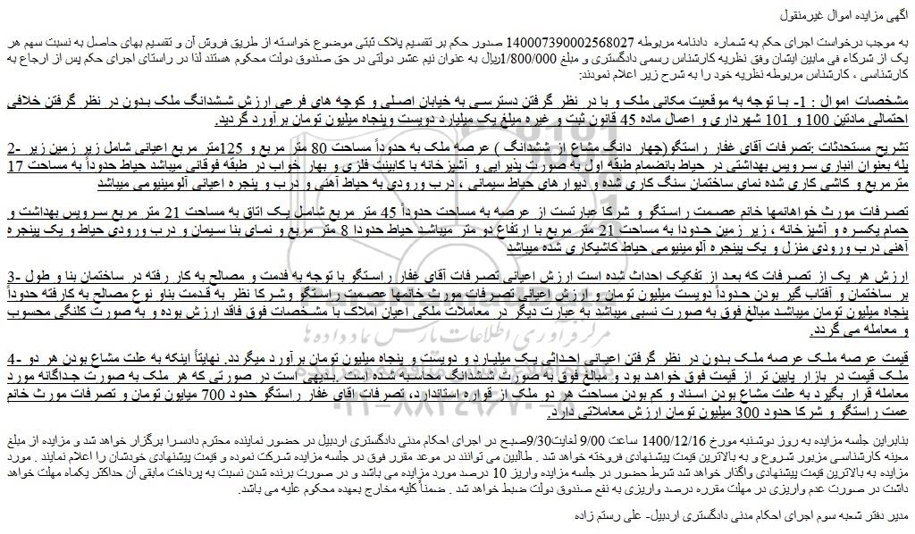 به موجب درخواست اجرای حکم به شماره  دادنامه مربوطه 140007390002568027 صدور حکم بر تقسیم پلاک ثبتی موضوع خواسته از طریق فروش آن و تقسیم بهای حاصل به نسبت سهم هر یک از شرکاء فی مابین ایشان وفق نظریه کارشناس رسمی دادگستری و مبلغ 1/800/000ریال به عنوان نیم عشر دولتی در حق صندوق دولت محکوم هستند لذا در راستای اجرای حکم پس از ارجاع به کارشناسی ، کارشناس مربوطه نظریه خود را به شرح زیر اعلام نمودند: