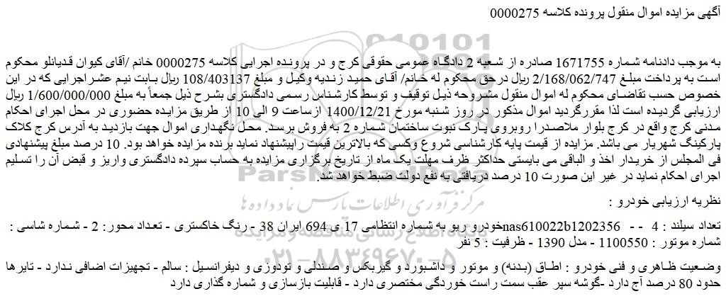 آگهی مزایده اموال منقول پرونده کلاسه 0000275