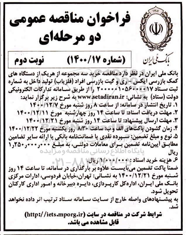 بانک ملی ایران در نظر دارد مناقصه خرید سه مجموعه از هر یک از دستگاه های کمک بازرسی ایکس - ری و گیت بازرسی افراد (آشکار ساز فلز) تولید داخل به شماره ثبت 2000001056000017 را از طریق سامانه تدارکات الکترونیکی دولت ستاد به نشانی ستاد ایران به شرح زیر برگزار نماید: