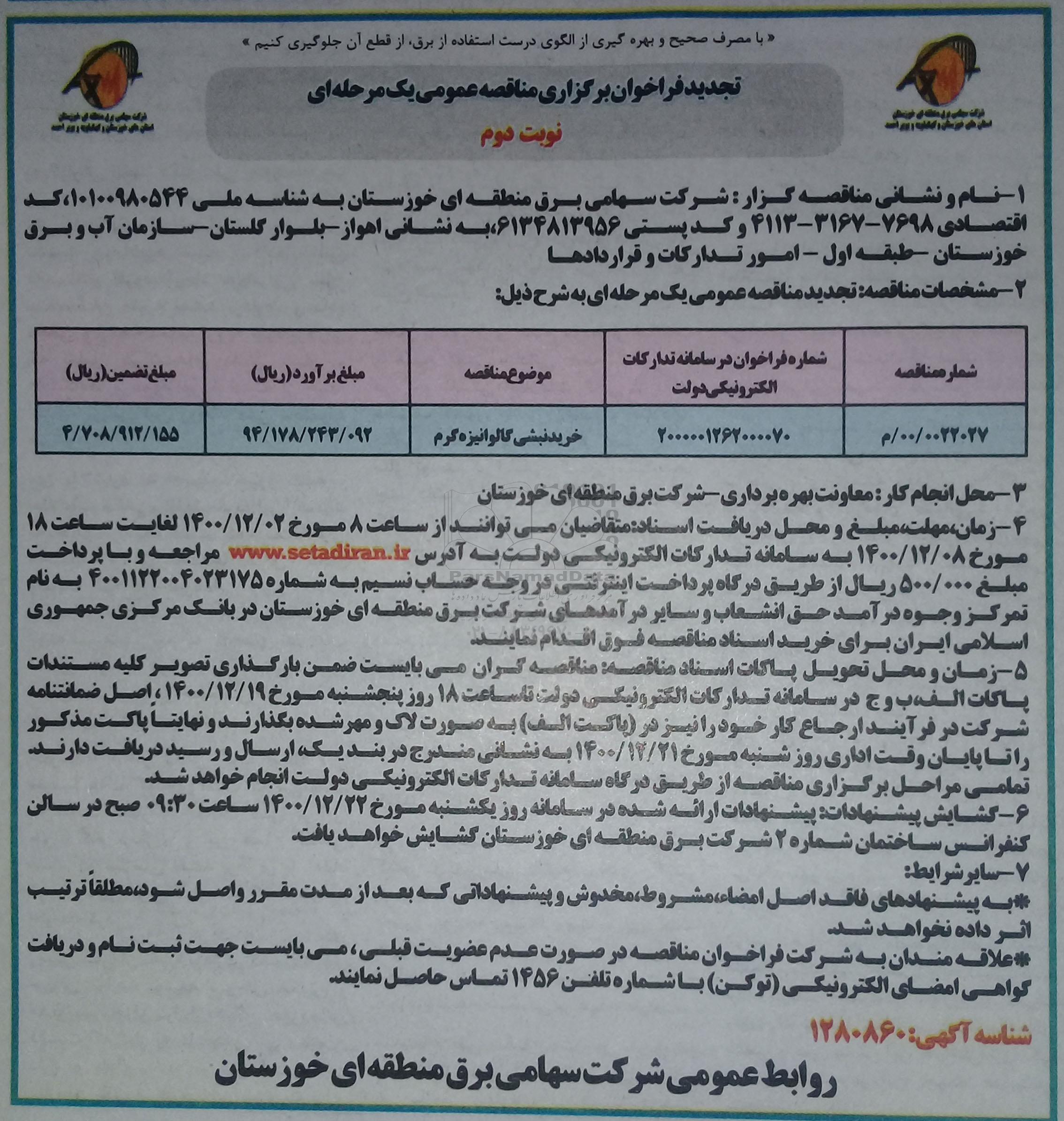 1. نام و نشانی مناقصه گزار: شرکت سهامی برق منطقه ای خوزستان به شناسه ملی