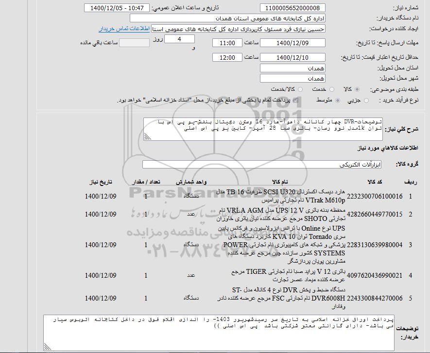 این مناقصه در تاریخ 1400/12/05 شروع و مهلت آن تا تاریخ 1400/12/09 میباشد.