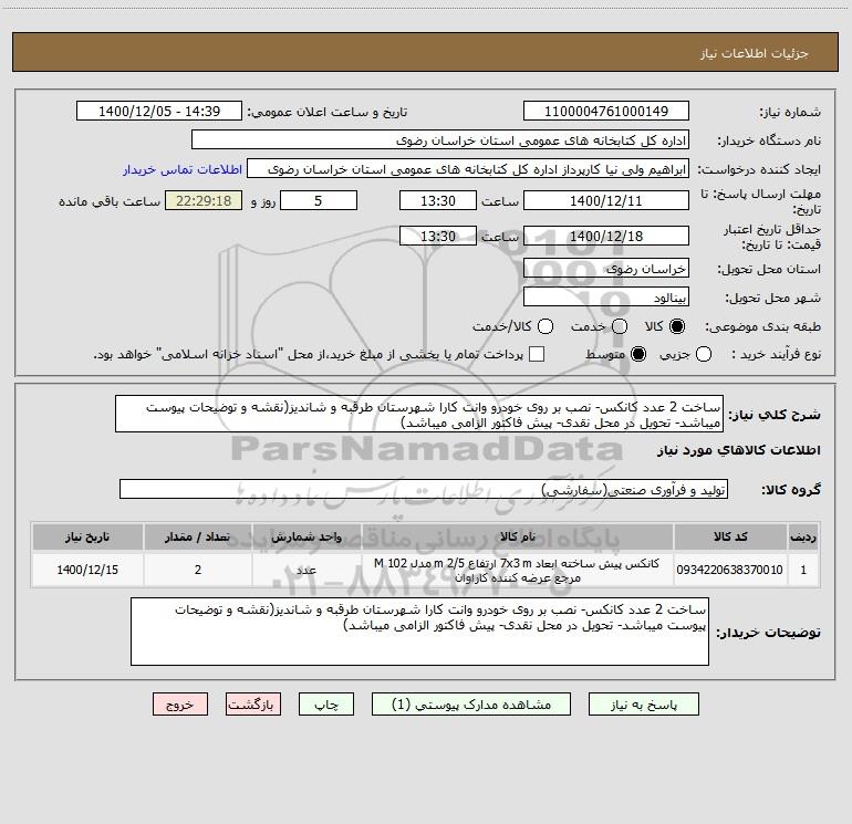 شرح کلی نیاز: ساخت 2 عدد کانکس- نصب بر روی خودرو وانت کارا شهرستان طرقبه و شاندیز(نقشه و توضیحات پیوست میباشد- تحویل در محل نقدی- پیش فاکتور الزامی میباشد)