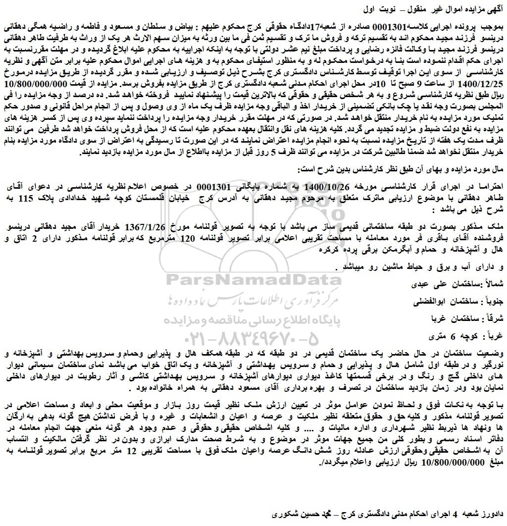 بموجب پرونده اجرایی کلاسه0001301 صادره از شعبه17دادگاه حقوقی کرج محکوم علیهم : بیاض و سلطان و مسعود و فاطمه و راضیه همگی دهقانی درینسو فرزند مجید محکوم اند به تقسیم ترکه و فروش ما ترک و تقسیم ثمن فی ما بین ورثه به میزان سهم الارث هر یک از وراث به طرفیت طاهر دهقانی درینسو فرزند مجید با وکالت فائزه رضایی و پرداخت مبلغ نیم عشر دولتی با توجه به اینکه اجراییه به محکوم علیه ابلاغ گردیده و در مهلت مقررنسبت به اجرای حکم اقدام ننموده است بنا به درخواست محکوم له و به منظور استیفای محکوم به و هزینه های اجرایی اموال محکوم علیه برابر متن آگهی و نظریه کارشناسی از سوی این اجرا توقیف توسط کارشناس دادگستری کرج بشرح ذیل توصیف و ارزیابی شده و مقرر گردیده از طریق مزایده درمورخ 1400/12/25 از ساعت 9 صبح تا 10در محل اجرای احکام مدنی شعبه دادگستری کرج از طریق مزایده بفروش برسد. مزایده از قیمت 10/800/000/000 ریال طبق نظریه کارشناسی شروع و به هر شخص حقیقی و حقوقی که بالاترین قیمت را پیشنهاد نمایید فروخته خواهد شد. ده درصد از وجه مزایده را فی المجلس بصورت وجه نقد یا چک بانکی تضمینی از خریدار اخذ و الباقی وجه مزایده ظرف یک ماه از وی وصول و پس از انجام مراحل قانونی و صدور حکم تملیک مورد مزایده به نام خریدار منتقل خواهد شد. در صورتی که در مهلت مقرر خریدار وجه مزایده را پرداخت ننماید سپرده وی پس از کسر هزینه های مزایده به نفع دولت ضبط و مزایده تجدید می گردد. کلیه هزینه های نقل وانتقال بعهده محکوم علیه است که از محل فروش پرداخت خواهد شد طرفین می توانند ظرف مدت یک هفته از تاریخ مزایده نسبت به نحوه انجام مزایده اعتراض نمایند که در این صورت تا رسیدگی به اعتراض از سوی دادگاه مورد مزایده بنام خریدار منتقل نخواهد شد ضمنا طالبین شرکت در مزایده می توانند ظرف 5 روز قبل از مزایده بااطلاع از مال مورد مزایده بازدید نمایند.