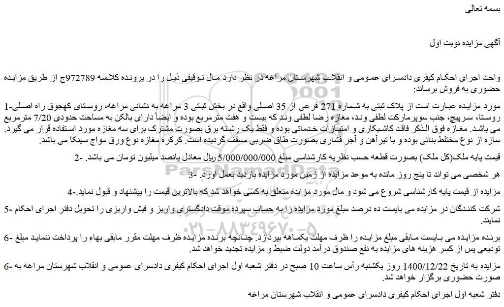 1-مورد مزایده عبارت است از پلاک ثبتی به شماره 271 فرعی از 35 اصلی واقع در بخش ثبتی 3 مراغه به نشانی مراغه، روستای کهجوق راه اصلی روستا، سرپیچ، جنب سوپرمارکت لطفی وند، مغازه رضا لطفی وند که بیست و هفت مترمربع بوده و ایضاً دارای بالکن به مساحت حدودی 7/20 مترمربع می باشد. مغازه فوق الذکر فاقد کاشیکاری و امتیازات خدماتی بوده و فقط یک رشته برق بصورت مشترک برای سه مغازه مورد استفاده قرار می گیرد. سازه از نوع مختلط بنائی بوده و با تیرآهن و آجر فشاری بصورت طاق ضربی مسقف گردیده است. کرکره مغازه نوع ورق مواج سینکا می باشد.
