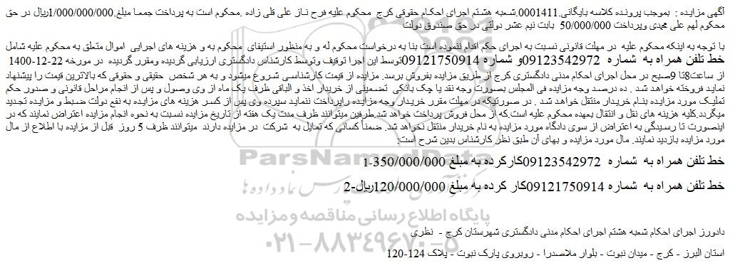 آگهی مزایده :  بموجب پرونده کلاسه بایگانی.0001411.شعبه هشتم اجرای احکام حقوقی کرج  محکوم علیه فرح ناز علی قلی زاده .محکوم است به پرداخت جمعا مبلغ.1/000/000/000ریال در حق محکوم لهم علی محمدی وپرداخت 50/000/000  بابت نیم عشر دولتی در حق صندوق دولت