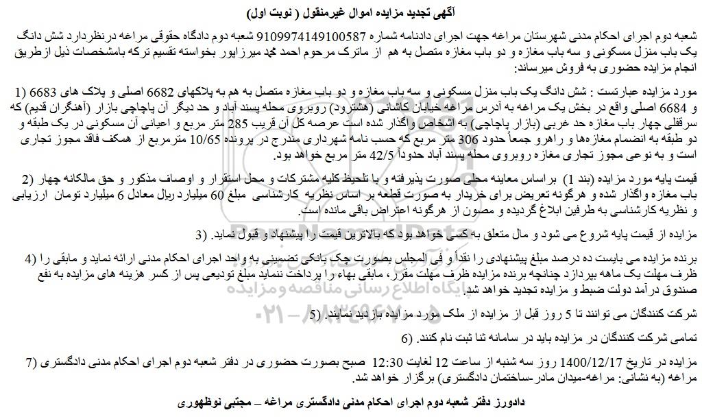 شعبه دوم اجرای احکام مدنی شهرستان مراغه جهت اجرای دادنامه شماره 9109974149100587 شعبه دوم دادگاه حقوقی مراغه درنظردارد شش دانگ یک باب منزل مسکونی و سه باب مغازه و دو باب مغازه متصل به هم از ماترک مرحوم احمد محمد میرزاپور بخواسته تقسیم ترکه بامشخصات ذیل ازطریق انجام مزایده حضوری به فروش میرساند: