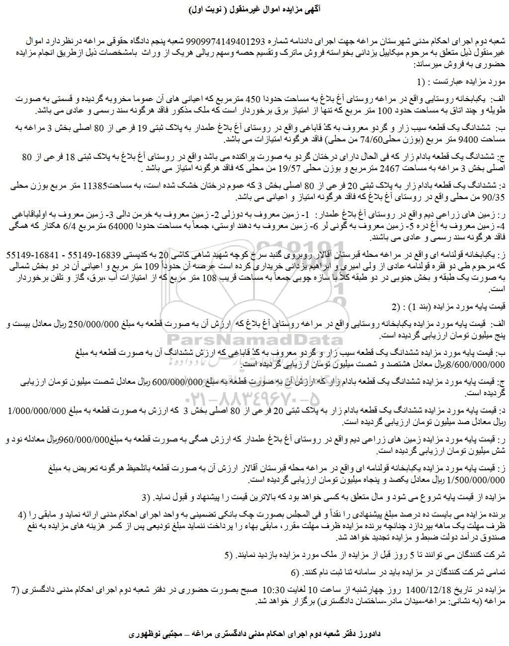 شعبه دوم اجرای احکام مدنی شهرستان مراغه جهت اجرای دادنامه شماره 9909974149401293 شعبه پنجم دادگاه حقوقی مراغه درنظردارد اموال غیرمنقول ذیل متعلق به مرحوم میکاییل یزدانی بخواسته فروش ماترک وتقسیم حصه وسهم ریالی هریک از وراث بامشخصات ذیل ازطریق انجام مزایده حضوری به فروش میرساند: