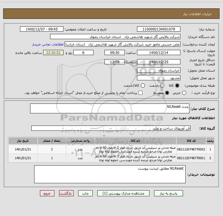 نام دستگاه خریدار:شرکت پالایش گاز شهید هاشمی نژاد استان خراسان رضوی