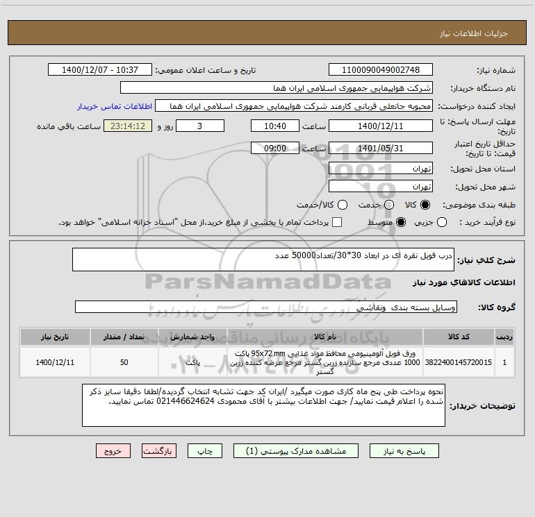 شرح کلی نیاز: درب فویل نقره ای در ابعاد 30*30/تعداد50000 عدد
