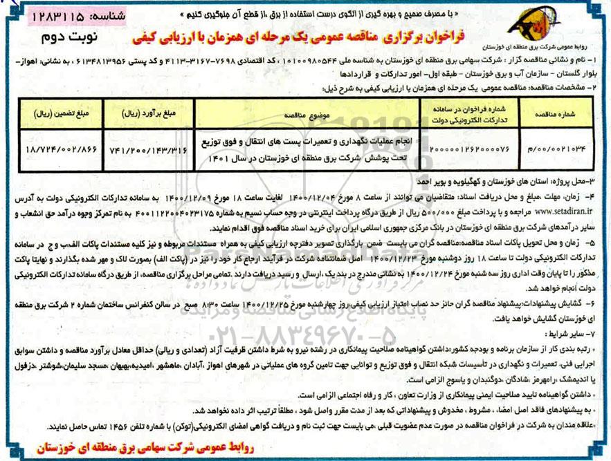 2000001262000076 | انجام عملیات نگهداری و تعمیرات پست های انتقال و فوق توزیع تحت پوشش شرکت برق منطقه ای خوزستان در سال 1401 |
